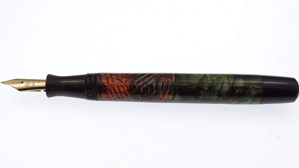 Samo pióro posiada przejrzyste okienko podglądu, ślepa skuwka zabezpiecza pokrętło tłoka, a stalówka jest lekko elastyczna. Niebanalne, gustowne pióro, w bardzo dobrej kondycji.