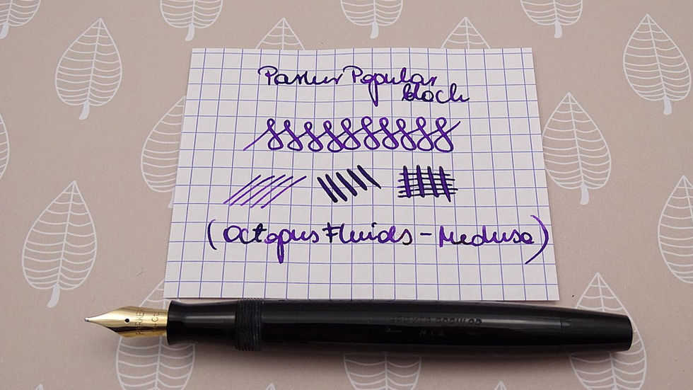 Parker Popular został stworzony na rynek Skandynawski – miał być tańszym następcą Parkera „VS” i bazował na modelu Victory MK IV. Mocowanie klipsa i ślepa skuwka są w tym samym kolorze, co reszta pióra. O tych piórach już też się rozpisywałam, są bardzo porządne, poprawne i jeszcze długo posłużą. Elastyczna stalówka zachęca do sprawdzenia jej możliwości i pozwala pobawić się szerokością linii.