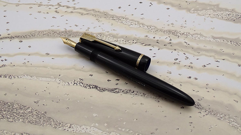 Czarny ze złotymi wkończeniami Parker Slimfold został wyprodukowany w Anglii, w roku 1964 ( to oznacza ta "4" na stalówce), pióro jest z aerometrycznym systemem napełniania, 14-karatową stalówką i zakręcaną skuwką. Z kolei cyfra "5" to było oznaczenie wprowadzone po roku 1958 i oznacza właśnie model Slimfold. Lady miało "4", Junior "10", itd.