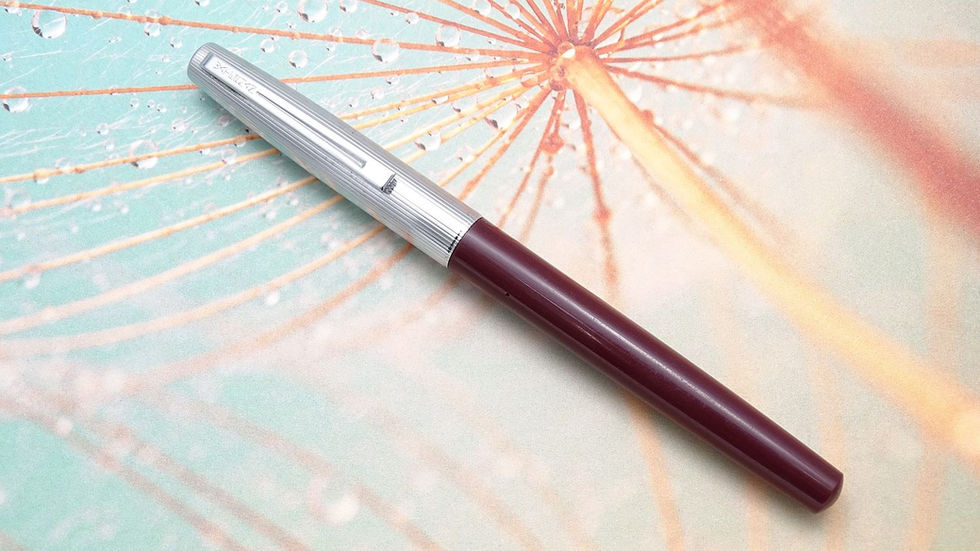 Przyzwoity model Watermana francuskiej produkcji, kryta stalówka, ale naboje muszą być specjalne - albo może to ja nie wierzę w te zbyt lekko się trzymające. Nabój pusty z epoki dokładam. Pióro samo w sobie lekkie, zgrabne i powabne, w końcu to Francja, prawda? A gdyby ktoś zwracał uwagę na aspekt dźwiękowy - pióro fajnie klika przy zamykaniu, to taki metaliczny, słyszalny wyraźny "klik". Bliźniaczy model ma wypisane na korpusie, że to Flash, tu tego nie ma, ale są identyczne, więc tak też go określam.